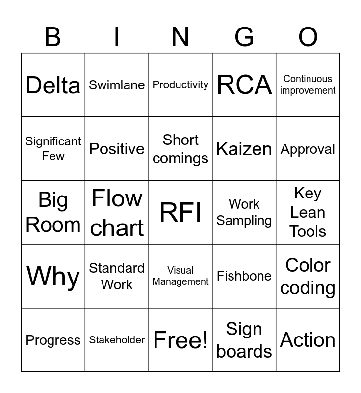 This bingo card has 25 words: Why, Stakeholder, RFI, Sign boards, Continuous improvement, Delta, Swimlane, Productivity, Work Sampling, Color coding, Significant Few, Positive, Free!, Fishbone, Approval, Progress, Flow chart, Short comings, Kaizen, Key Lean Tools, Big Room, Standard Work, Visual Management, RCA and Action.