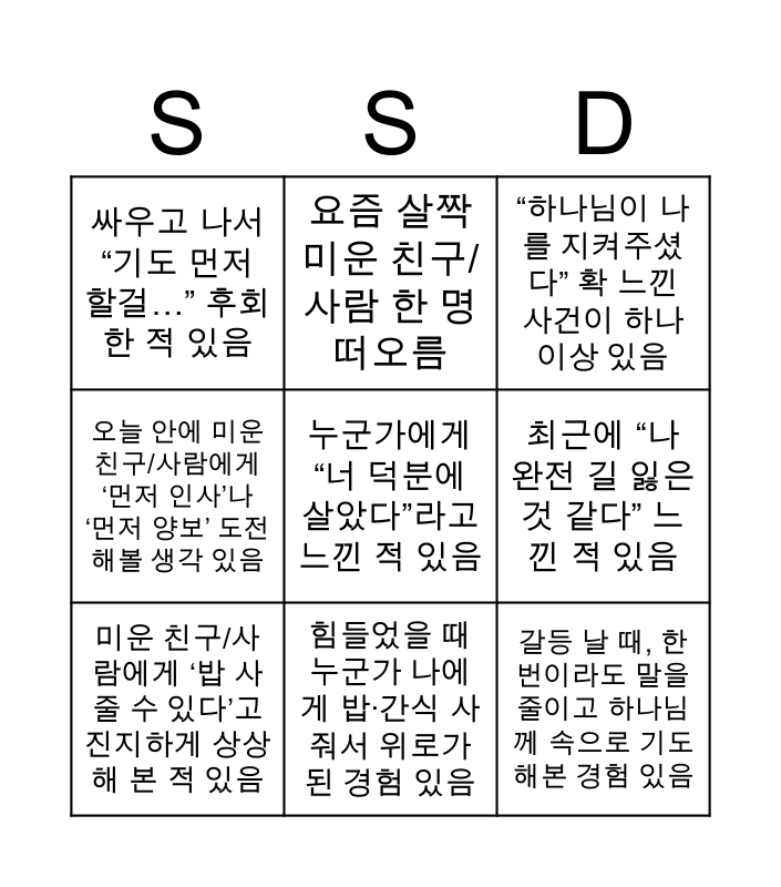 This bingo card has a free space and 8 words: 최근에 “나 완전 길 잃은 것 같다” 느낀 적 있음, “하나님이 나를 지켜주셨다” 확 느낀 사건이 하나 이상 있음, 요즘 살짝 미운 친구/사람 한 명 떠오름, 미운 친구/사람에게 ‘밥 사줄 수 있다’고 진지하게 상상해 본 적 있음, 싸우고 나서 “기도 먼저 할걸…” 후회한 적 있음, 갈등 날 때, 한 번이라도 말을 줄이고 하나님께 속으로 기도해본 경험 있음, 오늘 안에 미운 친구/사람에게 ‘먼저 인사’나 ‘먼저 양보’ 도전해볼 생각 있음 and 힘들었을 때 누군가 나에게 밥·간식 사줘서 위로가 된 경험 있음.