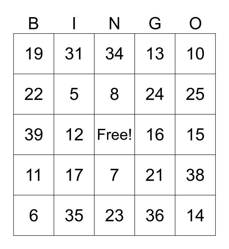 This bingo card has a free space and 39 words: 2, 3, 4, 5, 6, 7, 8, 9, 10, 11, 12, 13, 14, 15, 16, 17, 18, 19, 20, 21, 22, 23, 24, 25, 26, 27, 28, 29, 30, 31, 32, 33, 34, 35, 36, 37, 38, 39 and 40.