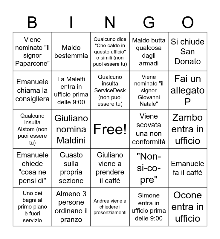 This bingo card has a free space and 53 words: Alpi entra in ufficio, Ocone entra in ufficio, Giacobbe entra in ufficio, Simone entra in ufficio prima delle 9:00, Guasto sulla propria sezione, Emanuele canta, Maldo bestemmia, La Chiodi fa la montanara, Emanuele chiama la consigliera, Emanuele fa una molestia, La Maletti entra in ufficio prima delle 9:00, Chiamano Maldini per aiuto col PC, Emanuele fa il caffè, "Non-si-co-pre", Antonio viene a prendere il caffè, Uno dei bagni al primo piano è fuori servizio, Qualcuno insulta ServiceDesk (non puoi essere tu), Viene scovata una non conformità, Tu fai un presenziamento alle 7:00, Si chiude San Donato, Giuliano nomina Maldini, Non c'è Iano, fai i ritardi (vale solo se li fai tu), Viene nominato "il signor Giovanni Natale", Viene nominato "il signor Paparcone", Dai il cambio ad un DCO/CS (per qualunque motivo), Almeno 3 persone ordinano il pranzo, Devis entra in ufficio, Qualcuno fa un razzismo, Qualcuno fa un omofobia, Fai un allegato P, Coletta dice "donna", Cozzolino entra in ufficio, Qualcuno della formazione entra in ufficio, Qualcuno porta da mangiare per tutti, C'è Mauro, La Landi racconta un aneddoto nella sua vita, Maldo butta qualcosa dagli armadi, Andrea viene a chiedere i presenziamenti, Qualcuno dice "Che caldo in questo ufficio" o simili (non puoi essere tu), Qualcuno dice "Che freddo in questo ufficio" o simili (non puoi essere tu), Carmen viene a prendere il caffè, Qualcuno del POI entra in ufficio, Zambo entra in ufficio, Qualcuno di DOIT entra in ufficio (non vale Antonio per il caffè), Il nucleo chiede aiuto, Giuliano viene a prendere il caffè, Emanuele arriva dopo le 10:00, Qualcuno fa FS, Qualcuno insulta Alstom (non puoi essere tu), Emanuele chiede "cosa ne pensi di", Qualcuno dice "vieni quando cazzo ti pare" (non puoi essere tu), Qualcuno dice "Revamping?" (non puoi essere tu) and Manu aspetta tutti per mangiare.