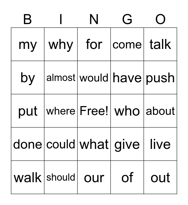 This bingo card has a free space and 24 words: could, should, would, walk, talk, my, by, why, who, what, have, put, give, live, almost, of, about, for, push, where, out, done, come and our.