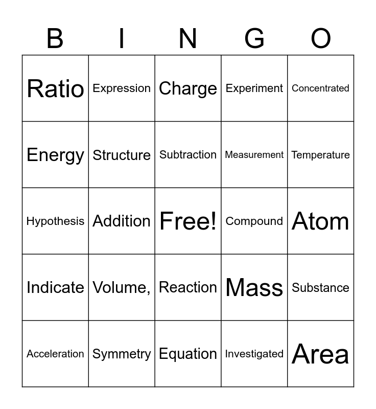 This bingo card has a free space and 24 words: Volume,, Symmetry, Subtraction, Acceleration, Concentrated, Ratio, Energy, Expression, Compound, Reaction, Measurement, Hypothesis, Mass, Substance, Structure, Investigated, Atom, Charge, Temperature, Addition, Area, Indicate, Experiment and Equation.