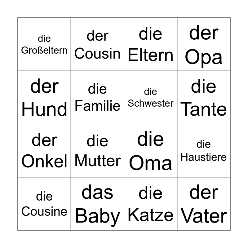 This bingo card has 18 words: die Mutter, der Vater, die Eltern, die Großeltern, die Oma, der Opa, die Cousine, der Cousin, die Tante, der Onkel, die Katze, der Hund, die Haustiere, die Familie, die Schwester, der Bruder, das Baby and die Geschwister.