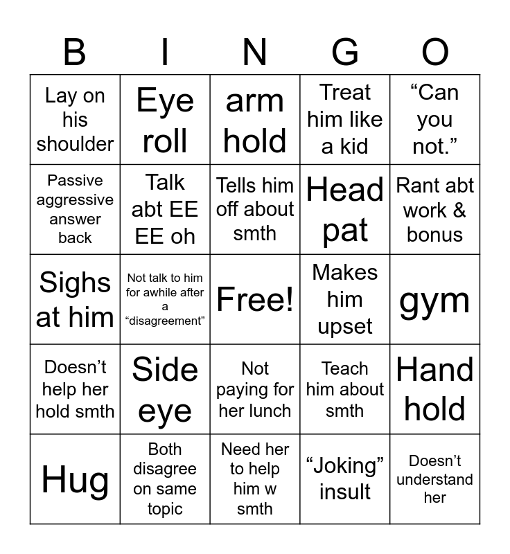 This bingo card has a free space and 24 words: Side eye, Both disagree on same topic, Tells him off about smth, Hug, “Can you not.”, Lay on his shoulder, Passive aggressive answer back, Eye roll, Makes him upset, Not paying for her lunch, Head pat, Sighs at him, Teach him about smth, Hand hold, Talk abt EE EE oh, “Joking” insult, gym, arm hold, Rant abt work & bonus, Not talk to him for awhile after a “disagreement”, Doesn’t understand her, Doesn’t help her hold smth, Treat him like a kid and Need her to help him w smth.