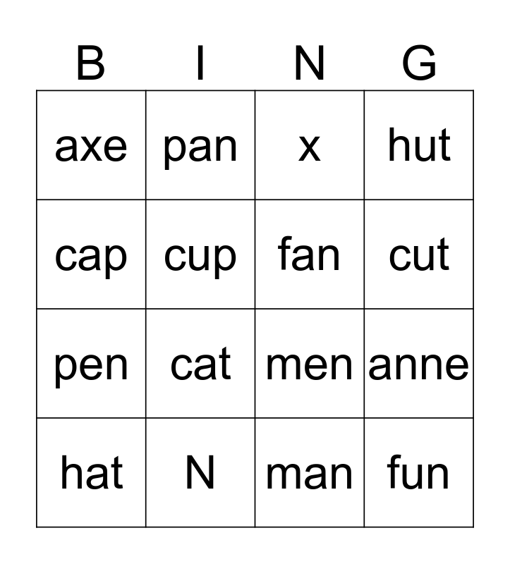 This bingo card has 16 words: N, anne, x, axe, pen, pan, men, man, cap, cup, hat, hut, cat, cut, fan and fun.