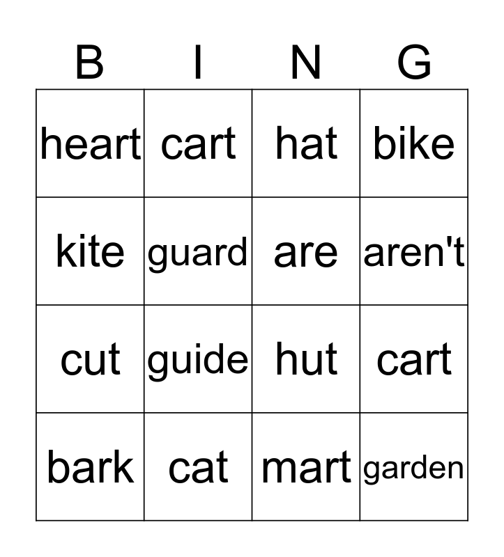 This bingo card has 16 words: cat, cart, hat, heart, cut, cart, hut, mart, kite, guard, bark, bike, guide, aren't, are and garden.