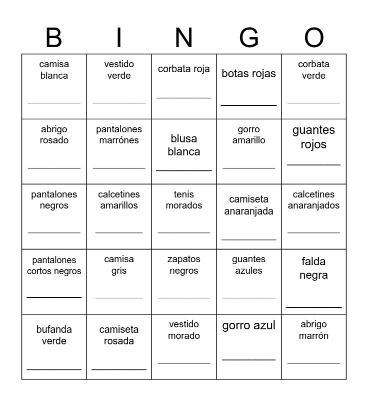 This bingo card has 30 words: camiseta rosada __________, pantalones cortos anaranjados _____________, calcetines amarillos _________, tenis blancos __________, camisa blanca __________, corbata roja __________, pantalones marrónes __________, zapatos negros __________, camiseta anaranjada __________, vestido morado __________, calcetines anaranjados __________, tenis morados __________, gorro azul ________, abrigo marrón __________, guantes rojos ________, camiseta roja __________, guantes azules __________, pantalones cortos negros ___________, camisa gris _________, corbata verde __________, pantalones negros __________, zapatos grises __________, vestido verde __________, gorro amarillo __________, abrigo rosado __________, botas rojas _________, falda negra _________, bufanda verde __________, blusa blanca _________ and zapatos verdes __________.