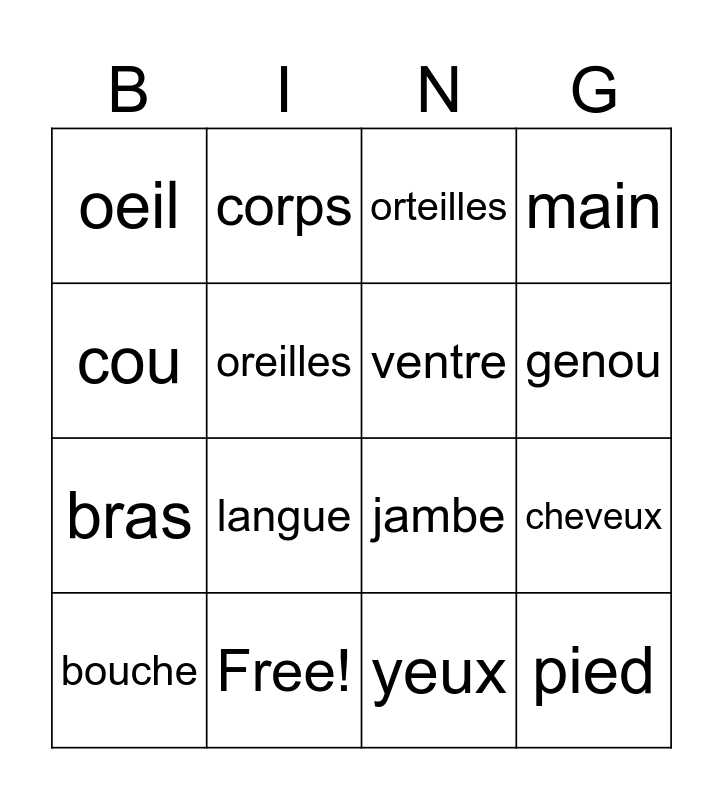 This bingo card has 21 words: Free!, tête, corps, visage, yeux, ventre, oeil, orteilles, jambe, genou, bras, main, pied, doights, oreilles, nez, bouche, langue, cou, cheveux and dents.