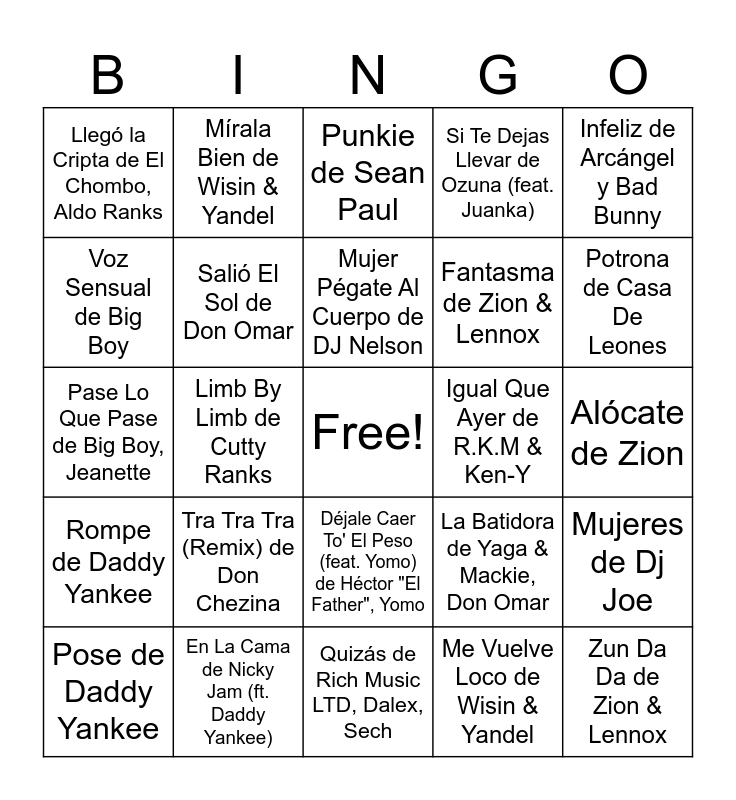This bingo card has a free space and 100 words: Acechándote de Yaga & Mackie, Agárrale el Pantalón de Alexis y Fido, feat. Zion y Lennox, Alócate de Zion, Ansias de Ledesma, Bandida de Zion & Lennox, Bandoleros de Don Omar, Tego Calderón, Cuéntale de Ivy Queen, DJ No Pare de Justin Quiles, Doncella de Zion & Lennox, Dónde Estan las Gatas de Alex Gargolas, Nicky Jam, Daddy Yankee, Dos Palgas de Jowell & Randy, Dulce Carita de Dalmata (feat. Zion y Lennox), Eh Oh, Eh Oh de Jowell & Randy, En La Cama de Nicky Jam (ft. Daddy Yankee), En la Disco Bailoteo de Wisin & Yandel, Esta Noche de Travesuras de DJ Nelson (feat. Héctor El Father), Fantasma de Zion & Lennox, Felina de Hector & Tito, Gata Celosa de Magnate Y Valentino, Hector & Tito, Gata Fiera de Trebol Clan, Héctor El Father y Joan, Guarachar de DJ Warner, Guatauba de Plan B, Guaya Guaya de Don Omar, Hay Algo en Ti de Luny Tunes, Noriega, Zion & Lennox, Hipócrita de Anuel AA y Zion, Igual Que Ayer de R.K.M & Ken-Y, Infeliz de Arcángel y Bad Bunny, La Batidora de Yaga & Mackie, Don Omar, La Llevo Al Cielo de Yung Caza, Chencho Corleone, La Player (Bandolera) de Zion & Lennox, Limb By Limb de Cutty Ranks, Llegó la Cripta de El Chombo, Aldo Ranks, Me Matas de R.K.M & Ken-Y, Me Pones en Tensión de Zion & Lennox, Me Vuelve Loco de Wisin & Yandel, Mujer Pégate Al Cuerpo de DJ Nelson, Mujeres de Dj Joe, Murder She Wrote de Chaka Demus & Pliers, No Le Temas A Él de Trebol Clan, No Me Conoce (Remix) de Jhayco, J Balvin, Bad Bunny, No Sé Si Fue de Arcángel, Ojitos Chiquitos de Don Omar, Pase Lo Que Pase de Big Boy, Jeanette, Perdóname de La Factoria, Eddy Lover, Potrona de Casa De Leones, Punkie de Sean Paul, Que Lloren de Ivy Queen, Que Tu Quieres de Jowell & Randy, Ñejo & Dalmata, Quizas de Tony Dize, Quizás de Rich Music LTD, Dalex, Sech, Quiero Bailar de Ivy Queen, Quiero Saber de Ivy Queen, Reggaeton Latino de Don Omar, Fat Joe, N.O.R.E., Reggaetoneando de Kale “La Evolución”, Regalame Una Noche de J Alvarez, Arcángel, Rómpelo de DJ Pedro Fuentes, Mad Fuentes, Shorty de Casa De Leones, Si Estoy Fácil de Hector & Tito, Si La Ves de Don Omar, R.K.M & Ken-Y, Si Te Dejas Llevar de Ozuna (feat. Juanka), Si Te Vas de Sech, Ozuna, Si Te Vas (Remix) de Héctor El Father, Kartiel y Zion, Si Tú me Calientas de Yaga & Mackie, Sigues Con Él de Arcángel, Sech y Dímelo Flow, Stars Are Blind (Remix) de Paris Hilton (ft. Luny Tunea y Wisin & Yandel), Sutra de Sebastian Yatra, Dalmata, Sistema de Zion & Lennox, Ta To Gucci (Remix) de Cauty, Brytiago, Darell, Te He Querido, Te He Llorado de Ivy Queen, Te la Tiro Pa Que Bailes de Dj Joe, Plan B, Tembleque de John Eric, Tra Tra Tra (Remix) de Don Chezina, Trayectoria (Remix) de Zion & Lennox, Tu Príncipe de Daddy Yankee, Zion & Lennox, Un Poco Loca de Jowell & Randy, De La Ghetto, Un Sueño de R.K.M & Ken-Y, Vete de Bad Bunny, Voz Sensual de Big Boy, Yo Soy Tu Gatita de La Factoría, Yo Voy A Llegar de Zion & Lennox, Yo Voy de Zion & Lennox (feat. Daddy Yankee), Zun Da Da de Zion & Lennox, Mayor Que Yo de Wisin & Yandel, Déjale Caer To' El Peso (feat. Yomo) de Héctor "El Father", Yomo, Llamé Pa' Verte (Bailando Sexy) de Wisin & Yandel, Mírala Bien de Wisin & Yandel, Saoco de Wisin, Daddy Yankee, 5 Letras de Alexis y Fido, Chica Ven Pa' Ca de Plan B, Rompe de Daddy Yankee, Rakata de Wisin & Yandel, Ven Bailalo de Angel Y Khriz, Noche De Sexo de Wisin & Yandel, Romeo Santos, Pose de Daddy Yankee, Salió El Sol de Don Omar, Siente El Boom de Boy Wonder CF, Tito "El Bambino", Randy Nota Loca, Yo No Soy Tu Marido de Nicky Jam, Gasolina de Daddy Yankee, No Tiene Novio de DJ Nelson, DJ Rafy Mercenario (feat. Nejo & Tego Calderon) and Papi Chulo de El Chombo y Lorna.