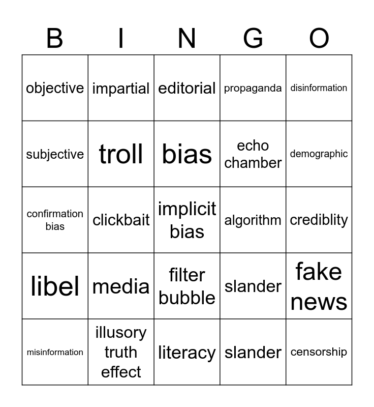 This bingo card has 25 words: media, literacy, bias, misinformation, disinformation, objective, subjective, impartial, algorithm, filter bubble, echo chamber, confirmation bias, slander, fake news, troll, censorship, crediblity, editorial, demographic, clickbait, implicit bias, illusory truth effect, libel, propaganda and slander.