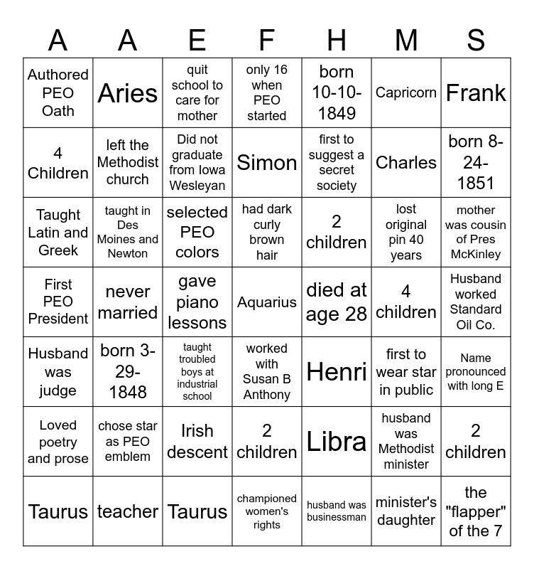This bingo card has 69 words: Born 5-8-1850, born 3-29-1848, born 5-8-1848, born 2-10-1852, born 10-10-1849, born 12-20-1848, born 8-24-1851, Taurus, Aries, Taurus, Aquarius, Libra, Capricorn, Frank, Washington, never married, Did not graduate from Iowa Wesleyan, Simon, taught music and art, Charles, Husband worked Standard Oil Co., 4 Children, taught in Des Moines and Newton, gave piano lessons, 2 children, Henri, 4 children, 2 children, Taught Latin and Greek, chose star as PEO emblem, quit school to care for mother, operated a China store, husband was businessman, lived longest, Name pronounced with long E, Husband was judge, teacher, taught troubled boys at industrial school, only 16 when PEO started, 2 children, lost original pin 40 years, mother was cousin of Pres McKinley, First PEO President, enjoyed dancing, never married, worked with Susan B Anthony, died at age 28, first to wear star in public, childhood home replaced by city hall, Authored PEO Oath, left the Methodist church, teacher of the year, championed women's rights, first to suggest a secret society, husband was Methodist minister, fine musician, "the intellectual one", tall willowy blonde with blue eyes, selected PEO colors, had dark curly brown hair, married by her father after church, fancy dresser, the "flapper" of the 7, Loved poetry and prose, Irish descent, minister's daughter, directed high school plays, auburn pompadour hair and wrote original PEO constitution.