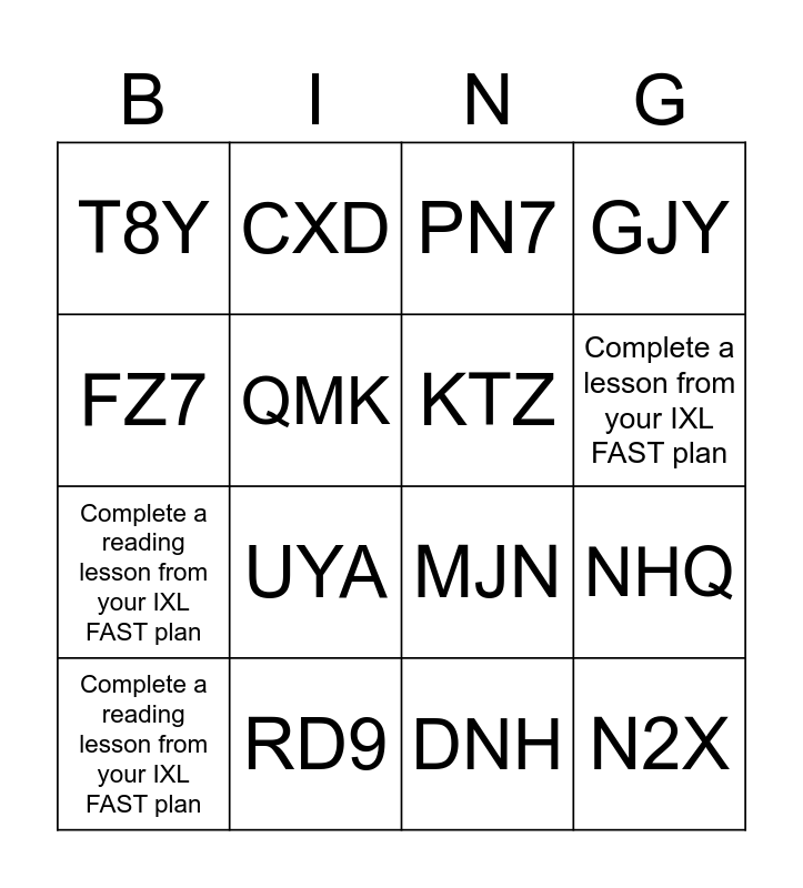 This bingo card has 16 words: RD9, NHQ, PN7, T8Y, Complete a reading lesson from your IXL FAST plan, CXD, MJN, DNH, FZ7, QMK, Complete a reading lesson from your IXL FAST plan, GJY, UYA, Complete a lesson from your IXL FAST plan, KTZ and N2X.
