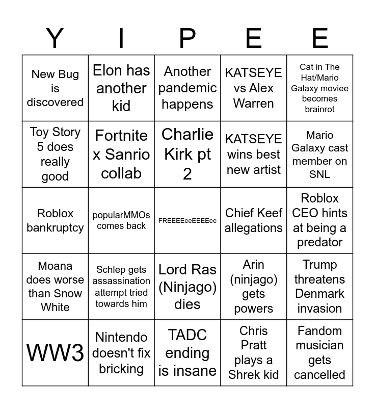 This bingo card has a free space and 34 words: Shrek 5 gets scrapped, Chris Pratt plays a Shrek kid, Mysterious family member in frozen 3 is olaf's child, Coyote vs ACME is good, Moana does worse than Snow White, Fortnite x Sanrio collab, Cat in The Hat/Mario Galaxy moviee becomes brainrot, WW3, Elon has another kid, Trump dies, Charlie Kirk pt 2, Another pandemic happens, There isn't a song of the summer, Charlie XCX album flops, Chief Keef allegations, Mario Galaxy cast member on SNL, Nintendo doesn't fix bricking, Roblox bankruptcy, Schlep gets assassination attempt tried towards him, Arin (ninjago) gets powers, Lord Ras (Ninjago) dies, Falcon's flight has to shut down, New Bug is discovered, Roblox CEO hints at being a predator, TADC ending is insane, Fandom musician gets cancelled, KATSEYE vs Alex Warren, Chromakopia wins best album, KATSEYE wins best new artist, Toy Story 5 does really good, War of The Worlds wins a Razzie, popularMMOs comes back, Trump threatens Denmark invasion and TikTok ban again.