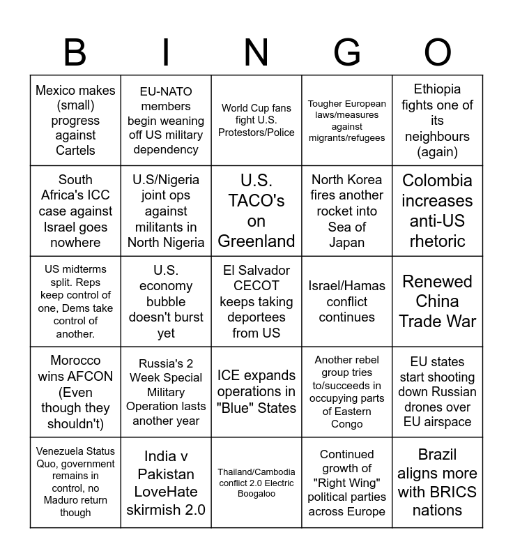 This bingo card has a free space and 24 words: Russia's 2 Week Special Military Operation lasts another year, India v Pakistan LoveHate skirmish 2.0, U.S. TACO's on Greenland, Venezuela Status Quo, government remains in control, no Maduro return though, Ethiopia fights one of its neighbours (again), Mexico makes (small) progress against Cartels, South Africa's ICC case against Israel goes nowhere, EU-NATO members begin weaning off US military dependency, Israel/Hamas conflict continues, ICE expands operations in "Blue" States, North Korea fires another rocket into Sea of Japan, US midterms split. Reps keep control of one, Dems take control of another., Another rebel group tries to/succeeds in occupying parts of Eastern Congo, EU states start shooting down Russian drones over EU airspace, U.S/Nigeria joint ops against militants in North Nigeria, Continued growth of "Right Wing" political parties across Europe, Renewed China Trade War, World Cup fans fight U.S. Protestors/Police, Colombia increases anti-US rhetoric, U.S. economy bubble doesn't burst yet, Brazil aligns more with BRICS nations, Morocco wins AFCON (Even though they shouldn't), Tougher European laws/measures against migrants/refugees and Thailand/Cambodia conflict 2.0 Electric Boogaloo.