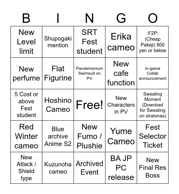 This bingo card has a free space and 85 words: Millenium Fest student, Valkyrie Fest student, SRT Fest student, Abydos Fest student, WildHunt Fest student, Gehenna Fest student, Akira, Akemi, Prof. Niya Niya, Aris or Key, New PV, Big Booba Figurine, Flat Figurine, New Characters in PV, New Raid boss, New Level limit, New Attack / Shield type, New perfume, Random JP place collab, New deca boss, New gamemode, New cafe function, New Final Res Boss, Mika Cameo, Hoshino Cameo, Hina Cameo, New Difficulty for Raid, Pakeji!, New Scrimmage Stage, Kotama Cameo (Kendrick Hopium), Blue archive Anime S2, Standee / Glass Figurine, 3 Cost or under Fest student, 5 Cost or above Fest student, New Gacha System, Updated on Archived Gacha, Archived Event, New event minigame mechanic, Red Winter cameo, In-game Collab announcement, Drink Collab, UOHHH Caster moment, Koyuki Jumpscare / Cameo, Erika Cameo, Hyakkiyako Fest, New BA Manga series, Yongha Kim (The Game director) cameo, Game Developer (Yuzu/Momoi/Midori/Aris) for 100 pulls, Hikari or Eimi for 100 pulls, Rio or Toki for 100 pulls, Shupogaki mention, Pandemonium Swimsuit on PV, Fox Platoon on PV, New wildhunt ALT on PV, Ayame cameo, Shuro cameo, Kuzunoha cameo, Erika cameo, Reveal of the next Prisoner, Vtuber stuff, BA LINE Stickers, New SONG Albums, New ASMR, New Single EP, :Trex: (Expensive Pakeji) 14400 Yen or Above, :F2P: (Cheap Pakeji) 800 yen or below, Limited Selector Ticket, Fest Selector Ticket, OVER 9 COST Fest student, GSC Cameo, Kaguya on PV, Kisaki Cameo, Shiroko Cameo, The crowd went nuts on fest students reveal, The crowd went silent on fest students reveal, New Fumo / Plushie, BA JP PC release, Club Wars announcement, TRIPLEEE FEST!?, Armpits Moment (Downbad for Pits on stratonas), Sweating Moment (Downbad for Sweating on stratonas), 1200 Pyrox Login Bonus, 600 Pyrox Login Bonus, Yume Cameo and Kendrick non-stop glasses talk.