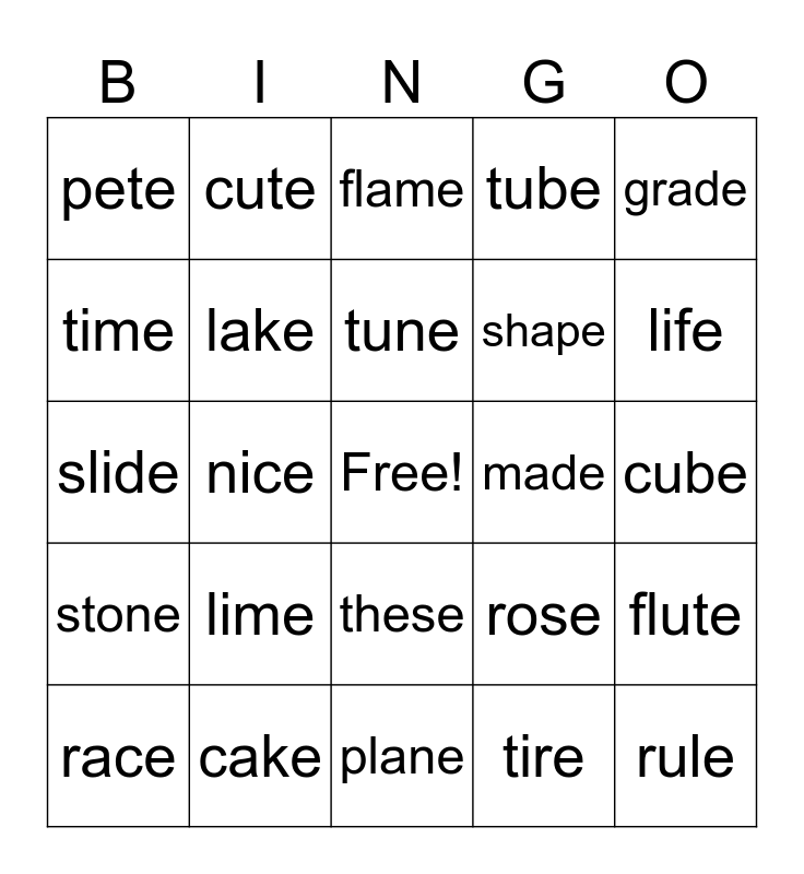 This bingo card has a free space and 24 words: lime, cake, tune, race, grade, pete, time, cute, made, these, shape, slide, rose, flute, lake, tire, cube, flame, life, nice, rule, stone, tube and plane.