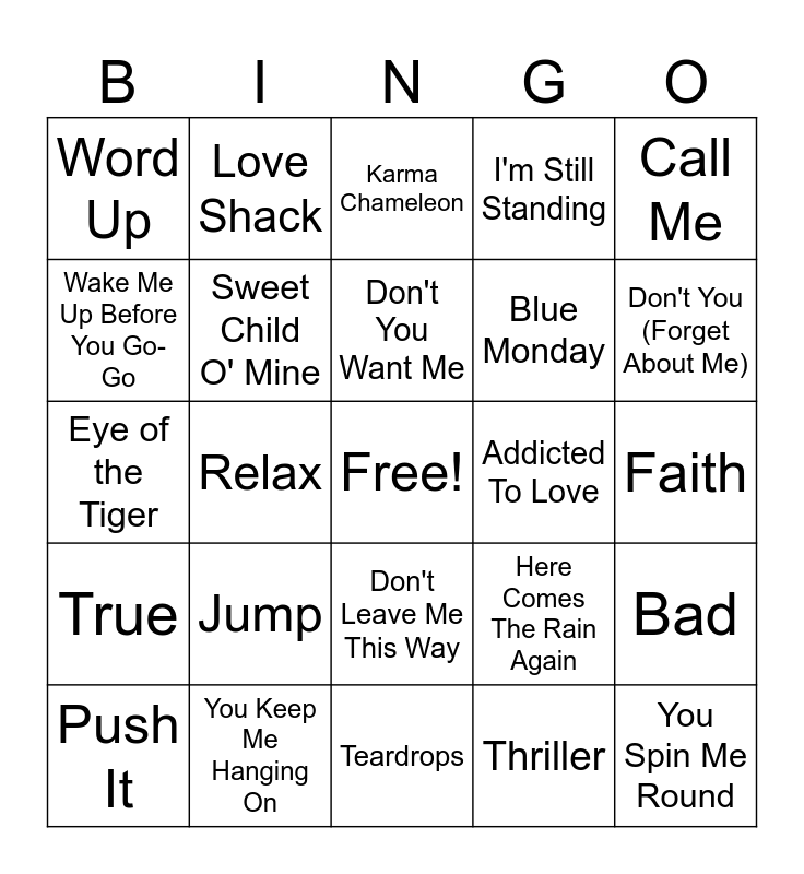 This bingo card has a free space and 75 words: Billie Jean, Take on Me, Karma Chameleon, Sweet Dreams (Are Made of This), Footloose, Girls Just Want to Have Fun, Never Gonna Give You Up, Celebration, Tainted Love, Africa, I Wanna Dance With Somebody, Like a Virgin, Don't You Want Me, Wake Me Up Before You Go-Go, Material Girl, Relax, Hungry Like The Wolf, You Spin Me Round, Venus, Call Me, Livin' On A Prayer, Eye of the Tiger, Sweet Child O' Mine, Love Shack, I'm Still Standing, Don't Stop Believin', Dancing In The Dark, 99 Red Balloons, Summer of '69, Maniac, Kids in America, Time After Time, The Power of Love, Here Comes The Rain Again, Don't You (Forget About Me), Blue Monday, Straight Up, Rio, Faith, Thriller, China In Your Hand, Take My Breath Away, Every Breath You Take, What's Love Got to do With It, Ghostbusters, It's Raining Men, Push It, Word Up, The Final Countdown, Never Ending Story, Flashdance - What a Feeling, Don't Leave Me This Way, Come On Eileen, Red Red Wine, I Should Be So Lucky, Don't Dream It's Over, Into The Groove, Walking on Sunshine, Fame, Let's Hear It for the Boy, Jump, Love is a Battlefield, You Can Call Me Al, Ain't Nobody, Don't Get Me Wrong, Addicted To Love, Come Back and Stay, I Want To Break Free, Walking on the Moon, Bad, True, You Keep Me Hanging On, The Look, Teardrops and Smalltown Boy.