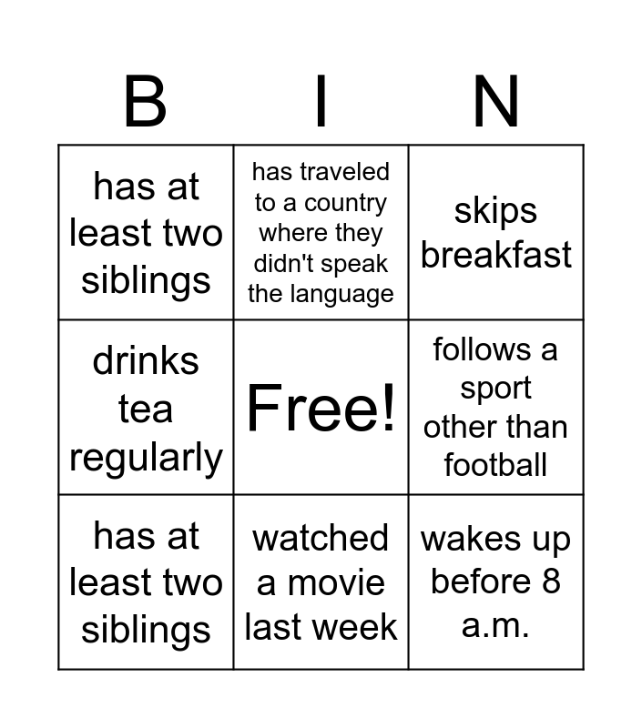 This bingo card has 24 words: wakes up before 8 a.m., listens to music while working, watched a movie last week, has a tattoo, Free!, has at least two siblings, follows a sport other than football, has traveled to a country where they didn't speak the language, skips breakfast, plays a music instrument/sings, wakes up before 8 a.m., listens to music while working, watched a movie last week, has a tattoo, has at least two siblings, follows a sport other than football, has traveled to a country where they didn't speak the language, skips breakfast, plays a music instrument/sings, reads or watches something in English, has dinner after 10 p.m., has lived in another city, drinks tea regularly and likes spicy food.