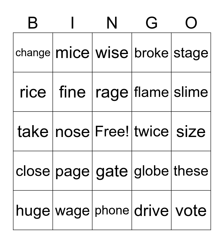 This bingo card has a free space and 24 words: page, wage, rage, huge, stage, change, rice, mice, twice, gate, flame, take, globe, these, fine, drive, size, wise, slime, nose, vote, close, broke and phone.