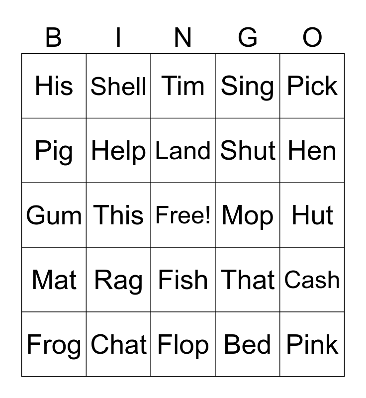This bingo card has a free space and 24 words: Rag, Chat, Land, Frog, Pick, His, Pig, Shell, Mop, Fish, Shut, Gum, That, Cash, Help, Bed, Hut, Tim, Hen, This, Pink, Mat, Sing and Flop.