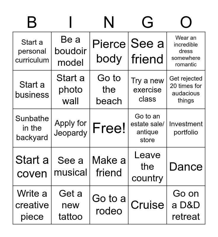 This bingo card has a free space and 24 words: See a musical, Get a new tattoo, Go to the beach, Write a creative piece, Wear an incredible dress somewhere romantic, Start a personal curriculum, Start a business, Be a boudoir model, Go to an estate sale/ antique store, Make a friend, Try a new exercise class, Sunbathe in the backyard, Leave the country, Dance, Start a photo wall, Cruise, Investment portfolio, Pierce body, Get rejected 20 times for audacious things, Apply for Jeopardy, Go on a D&D retreat, Start a coven, See a friend and Go to a rodeo.