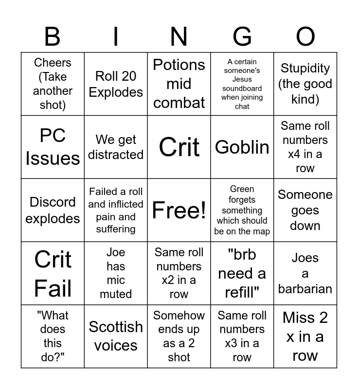This bingo card has a free space and 24 words: Joe has mic muted, Scottish voices, Crit, "What does this do?", Stupidity (the good kind), Cheers (Take another shot), PC Issues, Roll 20 Explodes, Green forgets something which should be on the map, Same roll numbers x2 in a row, Goblin, Discord explodes, "brb need a refill", Joes a barbarian, We get distracted, Same roll numbers x3 in a row, Someone goes down, Potions mid combat, Same roll numbers x4 in a row, Failed a roll and inflicted pain and suffering, Miss 2 x in a row, Crit Fail, A certain someone's Jesus soundboard when joining chat and Somehow ends up as a 2 shot.