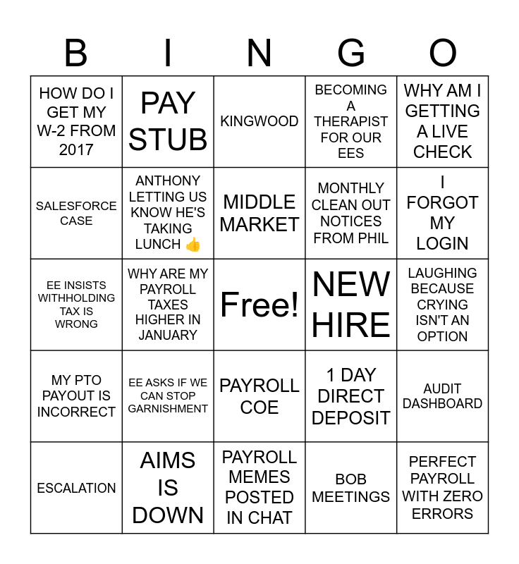 This bingo card has a free space and 33 words: PTO, Bingo Space, WHY ARE MY PAYROLL TAXES HIGHER IN JANUARY, WHERE IS MY FINAL CHECK, MY PTO PAYOUT IS INCORRECT, ANTHONY LETTING US KNOW HE'S TAKING LUNCH 👍, WHY AM I GETTING A LIVE CHECK, ESCALATION, PAY STUB, HOLIDAY PAY, MIDDLE MARKET, KINGWOOD, ASC, TERMINATION, NEW HIRE, I FORGOT MY LOGIN, AIMS IS DOWN, EE INSISTS WITHHOLDING TAX IS WRONG, EE ASKS IF WE CAN STOP GARNISHMENT, 1 DAY DIRECT DEPOSIT, PAYROLL COE, WHY IS MY BONUS TAXED HIGHER, HOW DO I GET MY W-2 FROM 2017, LAUGHING BECAUSE CRYING ISN'T AN OPTION, PAYROLL MEMES POSTED IN CHAT, PERFECT PAYROLL WITH ZERO ERRORS, BECOMING A THERAPIST FOR OUR EES, MONTHLY CLEAN OUT NOTICES FROM PHIL, SALESFORCE CASE, AUDIT DASHBOARD, WEEKLY REPORT CLIENT UPDATES, BOB MEETINGS and CAM/NEW ACCOUNTS.