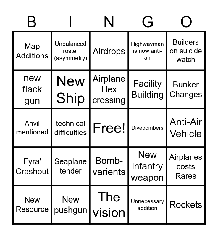 This bingo card has a free space and 24 words: Seaplane tender, New pushgun, Airplane Hex crossing, New Resource, Builders on suicide watch, Map Additions, new flack gun, Unbalanced roster (asymmetry), Divebombers, Bomb-varients, Facility Building, Anvil mentioned, New infantry weapon, Airplanes costs Rares, New Ship, Unnecessary addition, Anti-Air Vehicle, Airdrops, Bunker Changes, technical difficulties, Rockets, Fyra' Crashout, Highwayman is now anti-air and The vision.
