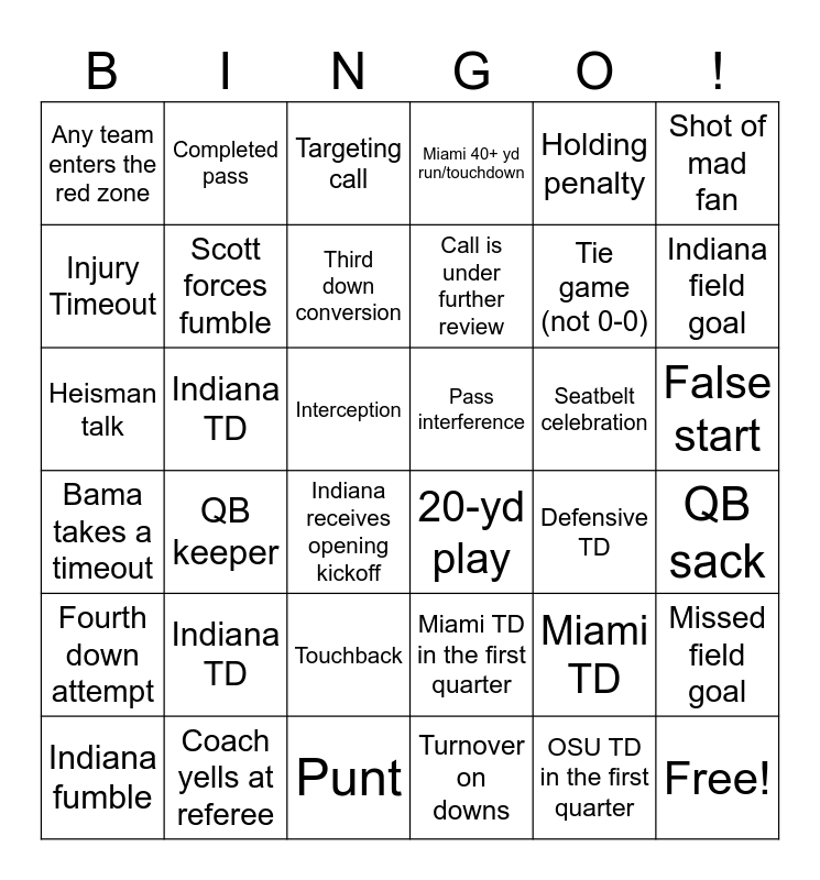 This bingo card has 42 words: OSU TD in the first quarter, Scott forces fumble, Cristobal yells are referee, Seatbelt celebration, QB sack, QB keeper, Heisman talk, Miami wins the natty, Targeting call, False start, Interception, Call is under further review, Indiana field goal, Holding penalty, Coach yells at referee, Bama takes a timeout, Missed field goal, Tie game (not 0-0), Free!, Completed pass, Shot of mad fan, Touchback, Fourth down attempt, Any team enters the red zone, QB runs for a TD, Indiana fumble, Third down conversion, Miami field goal, Indiana TD, Miami TD, Two-point attempt, Pass interference, Injury Timeout, Defensive TD, Punt, Indiana receives opening kickoff, 20-yd play, Indiana TD, Miami TD in the first quarter, Turnover on downs, Miami 40+ yd run/touchdown and Indiana TD in the first quarter.
