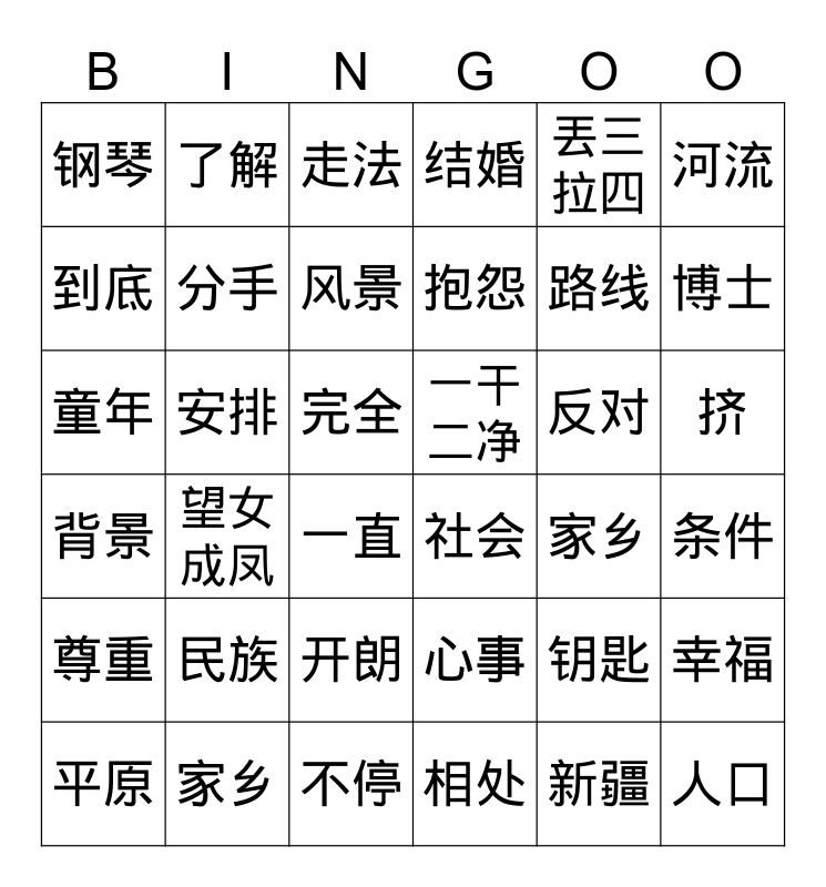 This bingo card has 36 words: 心事, 开朗, 相处, 到底, 背景, 一干二净, 分手, 不停, 丟三拉四, 钥匙, 博士, 结婚, 幸福, 安排, 抱怨, 钢琴, 尊重, 反对, 童年, 走法, 完全, 望女成凤, 社会, 一直, 家乡, 了解, 路线, 家乡, 风景, 河流, 人口, 平原, 条件, 挤, 民族 and 新疆.