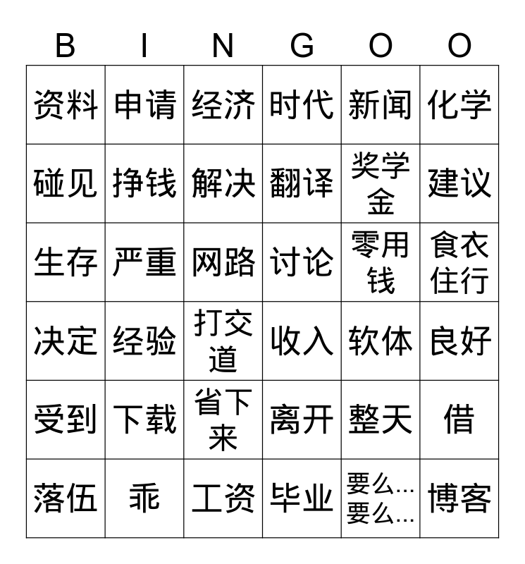 This bingo card has 36 words: 离开, 省下来, 毕业, 碰见, 决定, 讨论, 挣钱, 工资, 新闻, 整天, 建议, 时代, 借, 严重, 翻译, 资料, 受到, 零用钱, 生存, 经济, 网路, 经验, 收入, 打交道, 软体, 申请, 奖学金, 乖, 解决, 化学, 博客, 落伍, 良好, 食衣住行, 下载 and 要么...要么....