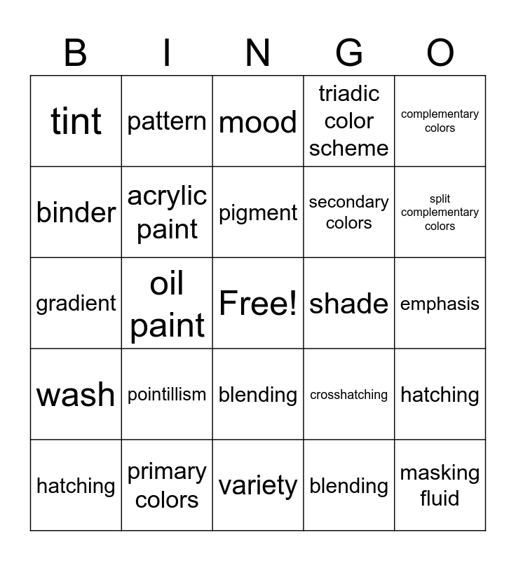 This bingo card has a free space and 39 words: color wheel, value, tertiary colors, acrylic paint, hatching, blending, pigment, proportion, complementary colors, wash, oil paint, triadic color scheme, masking fluid, emphasis, shade, pointillism, saturation, tint, neutrals, crosshatching, binder, variety, secondary colors, split complementary colors, negative space, unity, tone, hue, analogous, pattern, cool, perspective, mood, primary colors, blending, warm, hatching, gradient and gum arabic.