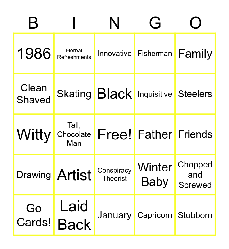 This bingo card has a free space and 24 words: Artist, Laid Back, Black, Go Cards!, Family, 1986, Clean Shaved, Herbal Refreshments, Father, Conspiracy Theorist, Inquisitive, Witty, Winter Baby, Chopped and Screwed, Skating, Capricorn, Friends, Innovative, Steelers, Tall, Chocolate Man, Stubborn, Drawing, Fisherman and January.