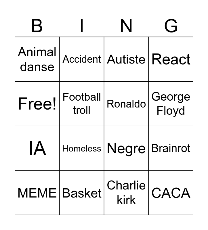 This bingo card has 16 words: Basket, Brainrot, Autiste, Animal danse, IA, Accident, Negre, Charlie kirk, Free!, Football troll, MEME, React, Homeless, George Floyd, Ronaldo and CACA.