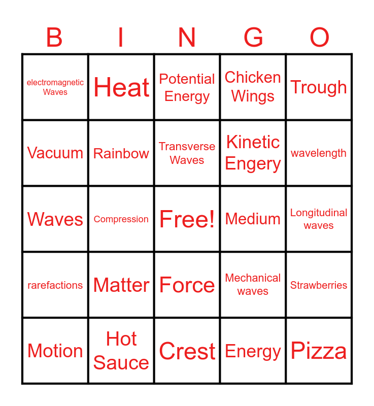 This bingo card has a free space and 24 words: Matter, Hot Sauce, Transverse Waves, Motion, Trough, electromagnetic Waves, Vacuum, Heat, Medium, Force, Kinetic Engery, Waves, Mechanical waves, Strawberries, Rainbow, Energy, Longitudinal waves, Potential Energy, wavelength, Compression, Pizza, rarefactions, Chicken Wings and Crest.