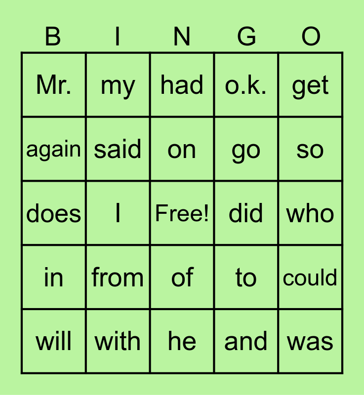 This bingo card has a free space and 34 words: the, and, good, is, in, said, get, will, my, a, on, had, got, is, did, so, with, does, from, to, of, she, Mr., who, he, was, o.k., fell, go, again, they, I, could and or.