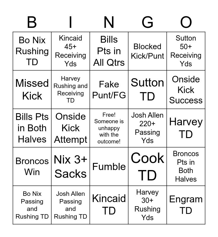 This bingo card has a free space and 54 words: Bills Win, Broncos Win, Interception, Pick 6, Fumble, Fumble 6, Blocked Kick/Punt, Kick/Punt 6, Missed Kick, Missed PAT, Bo Nix Rushing TD, Josh Allen Rushing TD, Josh Allen Passing and Rushing TD, Bo Nix Passing and Rushing TD, Should've been a Sack, Kincaid TD, Engram TD, Sutton TD, Shakir TD, Harvey TD, Cook TD, Bo Nix 230+ Passing Yds, Josh Allen 220+ Passing Yds, Sutton 50+ Receiving Yds, Shakir 50+ Receiving Yds, Kincaid 45+ Receiving Yds, Franklin 40+ Receiving Yds, Engram 25+ Receiving Yds, Cooks 90+ Rushing Yds, Harvey 30+ Rushing Yds, Allen 30+ Rushing Yds, Nix 20+ Rushing Yds, Lutz 2+ FG, Prater 2+ FG, Bills Pts in All Qtrs, Broncos Pts in All Qtrs, Bills Pts in Both Halves, Broncos Pts in Both Halves, QB Receiving TD, Harvey Rushing and Receiving TD, Cooks Rushing and Receiving TD, Bills TD and FG in each half, Broncos TD and FG in each half, Allen 3+ Sacks, Nix 3+ Sacks, Franklin TD, Coleman TD, OL/DL TD, Fake Punt/FG, Onside Kick Attempt, Onside Kick Success, BS Flag, Failed 4th Down Attempt and Successful 4th Down Attempt.