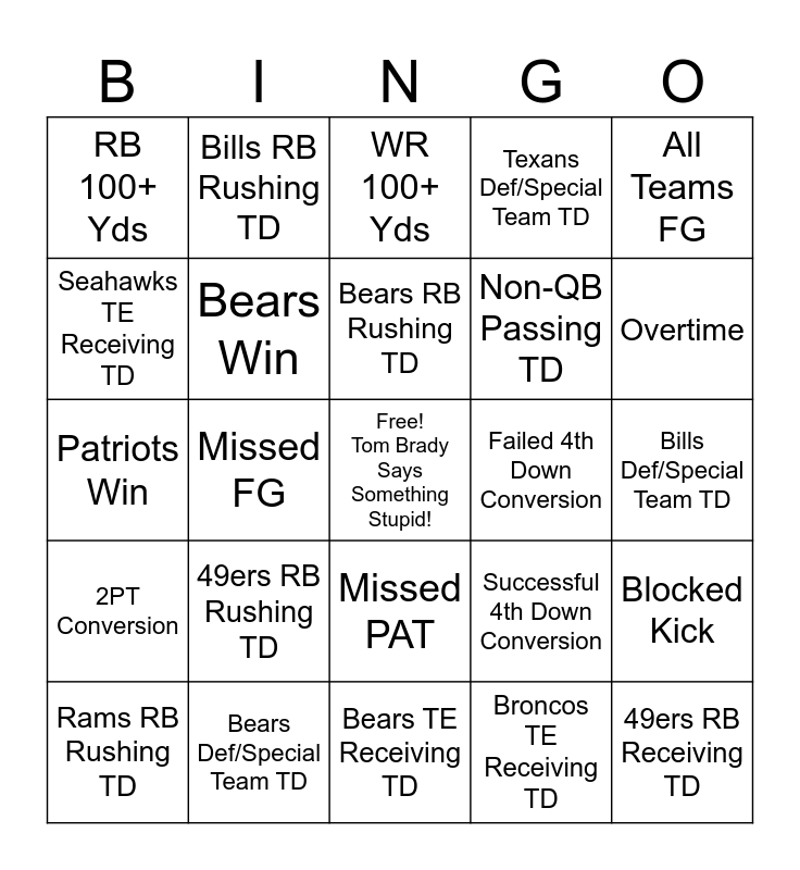 This bingo card has a free space and 69 words: Broncos Def/Special Team TD, Bills Def/Special Team TD, Seahawks Def/Special Team TD, 49ers Def/Special Team TD, Bears Def/Special Team TD, Rams Def/Special Team TD, Texans Def/Special Team TD, Patriots Def/Special Team TD, All Teams FG, All Teams TD, Blocked Kick, Blocked Punt, RB 100+ Yds, WR 100+ Yds, TE 100+ Yds, Missed FG, Missed PAT, Non-QB Passing TD, OL/DL Offensive TD, 2PT Conversion, Failed 4th Down Conversion, Successful 4th Down Conversion, Overtime, Safety, Broncos Win, Broncos RB Rushing TD, Broncos RB Receiving TD, Broncos WR Receiving TD, Broncos TE Receiving TD, Bills Win, Bills RB Rushing TD, Bills RB Receiving TD, Bills WR Receiving TD, Bills TE Receiving TD, Seahawks Win, Seahawks RB Rushing TD, Seahawks RB Receiving TD, Seahawks WR Receiving TD, Seahawks TE Receiving TD, 49ers Win, 49ers RB Rushing TD, 49ers RB Receiving TD, 49ers WR Receiving TD, 49ers TE Receiving TD, Rams Win, Rams RB Rushing TD, Rams RB Receiving TD, Rams WR Receiving TD, Rams TE Receiving TD, Bears Win, Bears RB Rushing TD, Bears RB Receiving TD, Bears WR Receiving TD, Bears TE Receiving TD, Texans Win, Texans RB Rushing TD, Texans RB Receiving TD, Texans WR Receiving TD, Texans TE Receiving TD, Patriots Win, Patriots RB Rushing TD, Patriots RB Receiving TD, Patriots WR Receiving TD, Patriots TE Receiving TD, Interception, Fumble, Onside Kick Attempt, Onside Kick Success and One Half Shut Out.