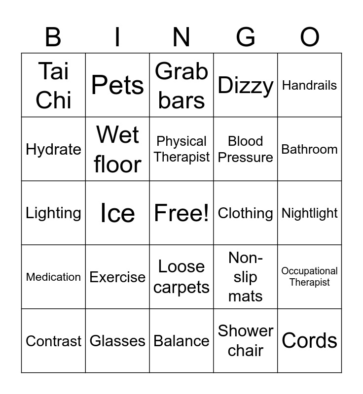 This bingo card has a free space and 24 words: Exercise, Glasses, Physical Therapist, Contrast, Handrails, Tai Chi, Hydrate, Pets, Clothing, Loose carpets, Blood Pressure, Lighting, Non-slip mats, Occupational Therapist, Wet floor, Shower chair, Nightlight, Grab bars, Bathroom, Ice, Cords, Medication, Dizzy and Balance.