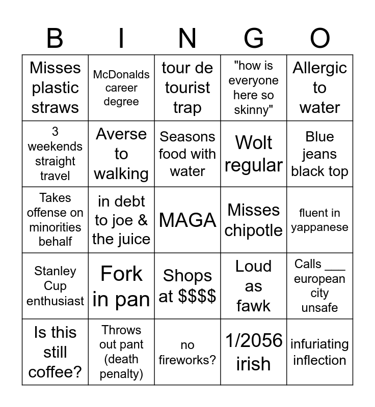 This bingo card has a free space and 24 words: Fork in pan, Throws out pant (death penalty), Seasons food with water, Is this still coffee?, Allergic to water, Misses plastic straws, 3 weekends straight travel, McDonalds career degree, Misses chipotle, Shops at $$$$, Wolt regular, Takes offense on minorities behalf, Loud as fawk, Calls ___ european city unsafe, Averse to walking, 1/2056 irish, fluent in yappanese, tour de tourist trap, Blue jeans black top, in debt to joe & the juice, infuriating inflection, Stanley Cup enthusiast, "how is everyone here so skinny" and no fireworks?.
