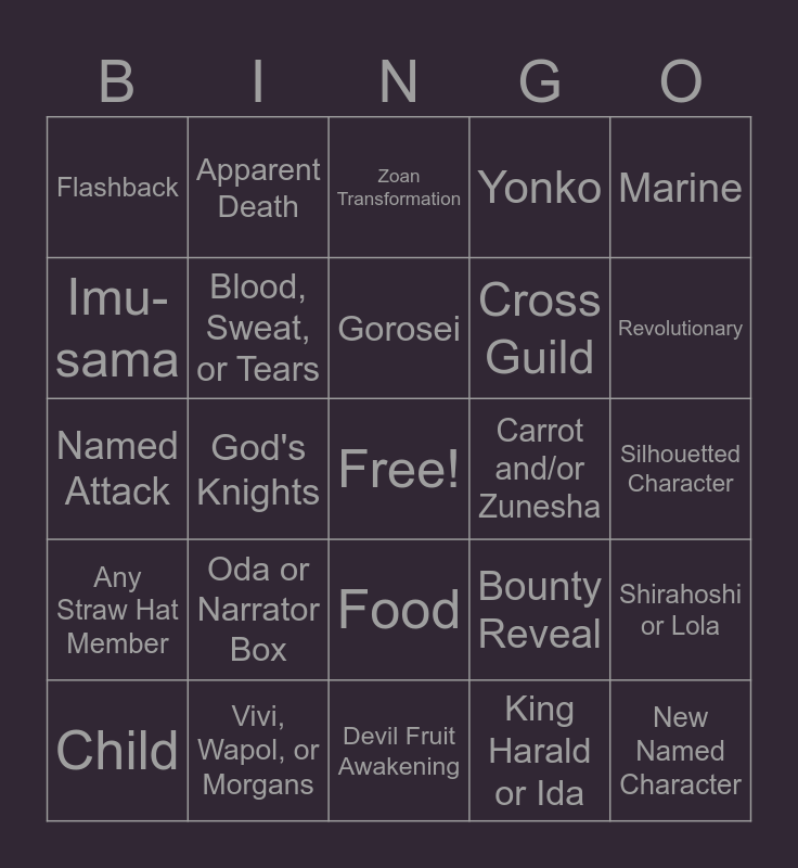 This bingo card has a free space and 30 words: Vivi, Wapol, or Morgans, Kid or Heart Pirates, God's Knights, New Named Devil Fruit, Flashback, Zoan Transformation, Blood, Sweat, or Tears, Food, Carrot and/or Zunesha, Devil Fruit Awakening, Silhouetted Character, New Named Character, King Harald or Ida, Straw Hat Grand Fleet Representative, Revolutionary, Joy Boy or Nika Mentioned, Bounty Reveal, Any Straw Hat Member, Oda or Narrator Box, Marine, Named Attack, Back to Present, Apparent Death, Cross Guild, Imu-sama, Yonko, Shirahoshi or Lola, Child, Gorosei and Any of the Roger Pirates.