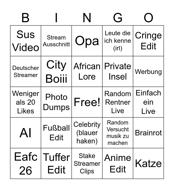 This bingo card has a free space and 24 words: Fußball Edit, Tuffer Edit, African Lore, Eafc 26, Cringe Edit, Sus Video, Deutscher Streamer, Stream Ausschnitt, Random Rentner Live, Celebrity (blauer haken), Private Insel, Weniger als 20 Likes, Random Versucht musik zu machen, Brainrot, City Boiii, Anime Edit, Einfach ein Live, Opa, Werbung, Photo Dumps, Katze, AI, Leute die ich kenne (irl) and Stake Streamer Clips.