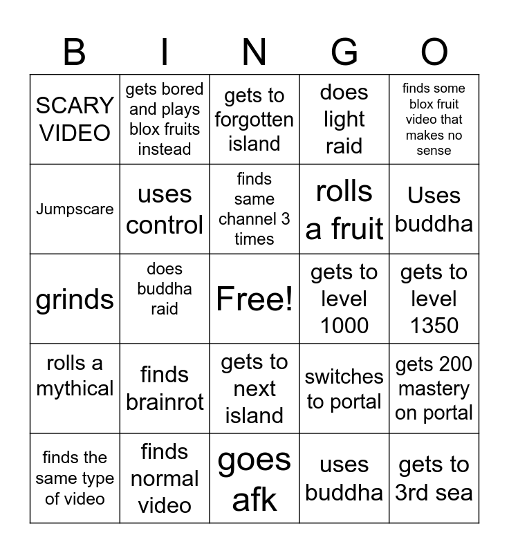 This bingo card has a free space and 24 words: finds brainrot, finds normal video, finds same channel 3 times, finds the same type of video, finds some blox fruit video that makes no sense, SCARY VIDEO, Jumpscare, gets bored and plays blox fruits instead, gets to level 1000, gets to next island, rolls a fruit, grinds, switches to portal, gets 200 mastery on portal, uses control, uses buddha, gets to level 1350, gets to forgotten island, Uses buddha, does buddha raid, gets to 3rd sea, rolls a mythical, does light raid and goes afk.