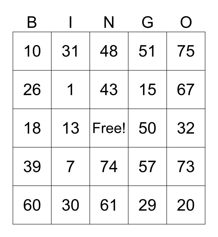 This bingo card has a free space and 24 words: 7, 30, 43, 60, 75, 10, 26, 31, 50, 74, 15, 18, 57, 73, 1, 29, 32, 48, 67, 13, 20, 39, 51 and 61.