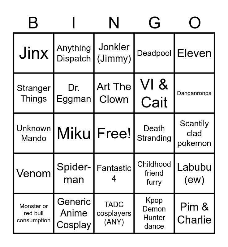 This bingo card has a free space and 24 words: Spider-man, Generic Anime Cosplay, Art The Clown, Monster or red bull consumption, Eleven, Jinx, Stranger Things, Anything Dispatch, Death Stranding, Fantastic 4, VI & Cait, Unknown Mando, Childhood friend furry, Labubu (ew), Dr. Eggman, Kpop Demon Hunter dance, Scantily clad pokemon, Jonkler (Jimmy), Danganronpa, Miku, Pim & Charlie, Venom, Deadpool and TADC cosplayers (ANY).