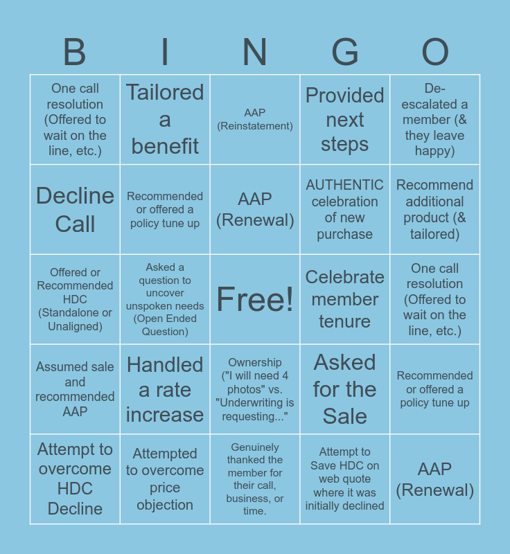 This bingo card has a free space and 24 words: Handled a rate increase, Attempted to overcome price objection, AAP (Renewal), Attempt to overcome HDC Decline, De-escalated a member (& they leave happy), One call resolution (Offered to wait on the line, etc.), Decline Call, Tailored a benefit, Celebrate member tenure, Ownership ("I will need 4 photos" vs. "Underwriting is requesting...", AUTHENTIC celebration of new purchase, Offered or Recommended HDC (Standalone or Unaligned), Asked for the Sale, Recommended or offered a policy tune up, Recommended or offered a policy tune up, Attempt to Save HDC on web quote where it was initially declined, One call resolution (Offered to wait on the line, etc.), AAP (Reinstatement), Recommend additional product (& tailored), Asked a question to uncover unspoken needs (Open Ended Question), AAP (Renewal), Assumed sale and recommended AAP, Provided next steps and Genuinely thanked the member for their call, business, or time..