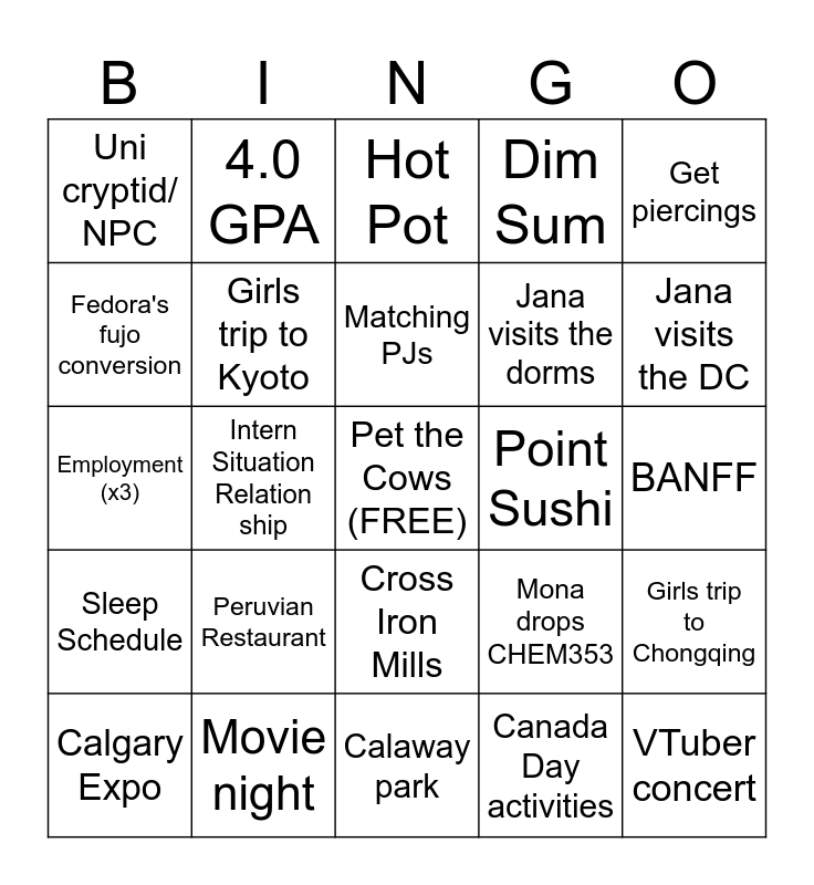 This bingo card has a free space and 24 words: Peruvian Restaurant, Movie night, Matching PJs, Calgary Expo, Get piercings, Uni cryptid/ NPC, Fedora's fujo conversion, 4.0 GPA, Point Sushi, Cross Iron Mills, Jana visits the dorms, Employment (x3), Mona drops CHEM353, Girls trip to Chongqing, Girls trip to Kyoto, Canada Day activities, BANFF, Hot Pot, Jana visits the DC, Intern Situation Relation ship, VTuber concert, Sleep Schedule, Dim Sum and Calaway park.