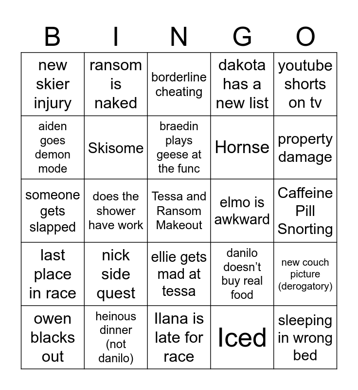 This bingo card has a free space and 24 words: nick side quest, heinous dinner (not danilo), braedin plays geese at the func, owen blacks out, youtube shorts on tv, new skier injury, aiden goes demon mode, ransom is naked, elmo is awkward, ellie gets mad at tessa, Hornse, someone gets slapped, danilo doesn’t buy real food, new couch picture (derogatory), Skisome, Iced, Caffeine Pill Snorting, borderline cheating, property damage, does the shower have work, sleeping in wrong bed, last place in race, dakota has a new list and Ilana is late for race.