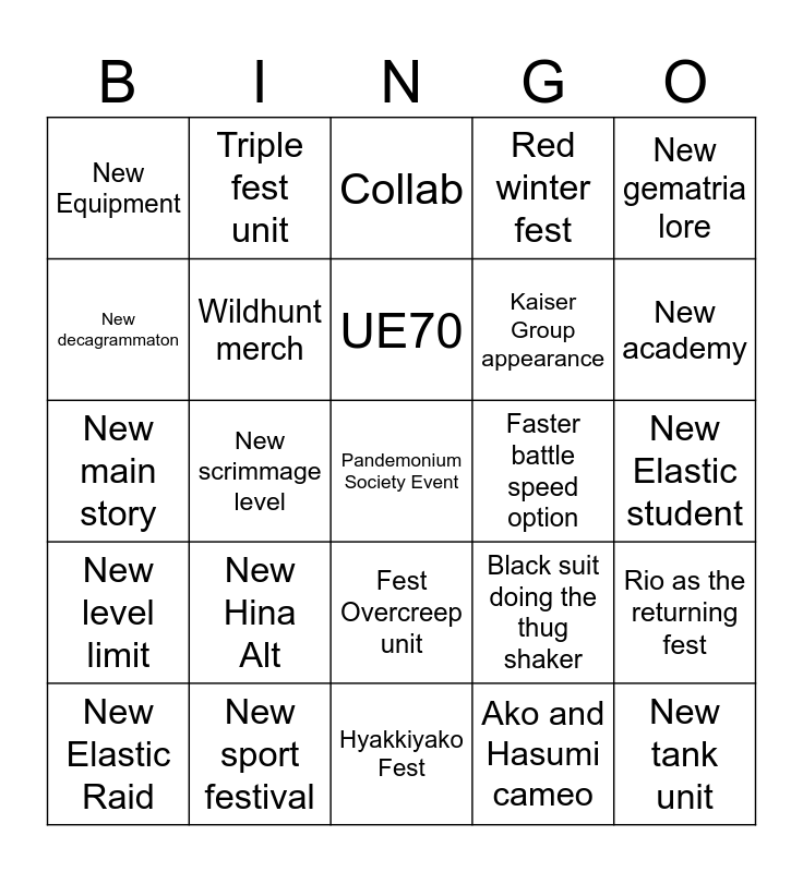 This bingo card has 25 words: New Hina Alt, Hyakkiyako Fest, UE70, New Elastic Raid, New gematria lore, New Equipment, New decagrammaton, Triple fest unit, Faster battle speed option, Fest Overcreep unit, Kaiser Group appearance, New main story, Black suit doing the thug shaker, Rio as the returning fest, Wildhunt merch, New tank unit, New Elastic student, Collab, New academy, New scrimmage level, Pandemonium Society Event, New sport festival, New level limit, Red winter fest and Ako and Hasumi cameo.