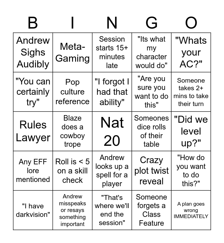 This bingo card has a free space and 24 words: Roll is < 5 on a skill check, Andrew misspeaks or resays something important, "I forgot I had that ability", "I have darkvision", "Whats your AC?", Andrew Sighs Audibly, "You can certainly try", Meta-Gaming, Someones dice rolls of their table, Andrew looks up a spell for a player, "Are you sure you want to do this", Rules Lawyer, Crazy plot twist reveal, "How do you want to do this?", Pop culture reference, Someone forgets a Class Feature, "Did we level up?", Session starts 15+ minutes late, Someone takes 2+ mins to take their turn, Blaze does a cowboy trope, A plan goes wrong IMMEDIATELY, Any EFF lore mentioned, "Its what my character would do" and "That's where we'll end the session".